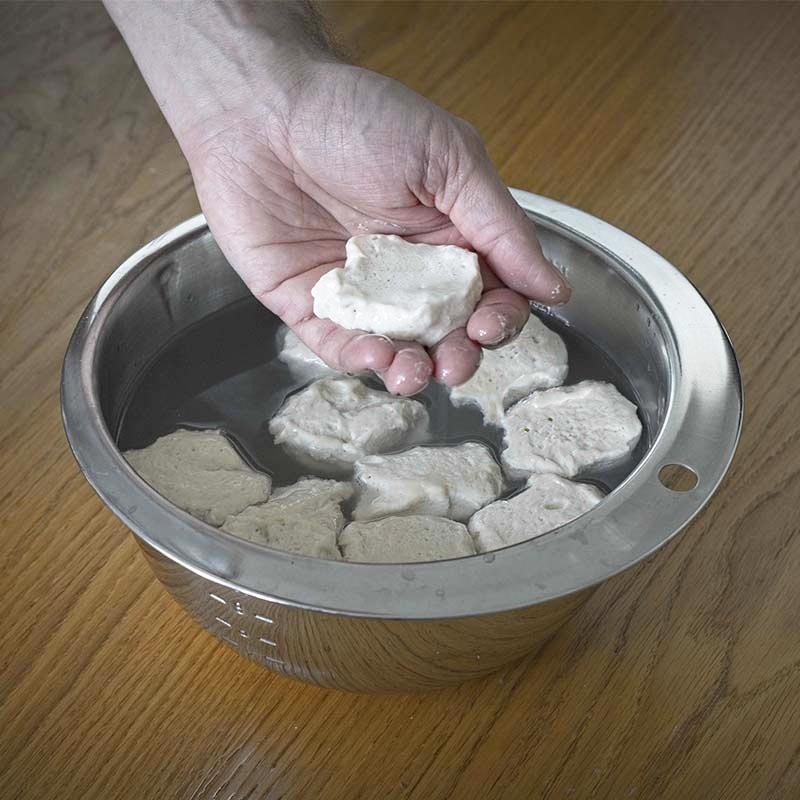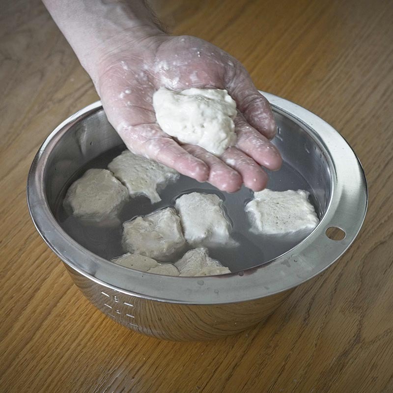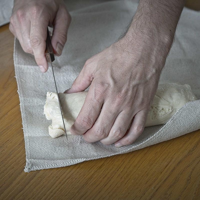 Это делается с помощью специальной техники: закваску, необходимую для обновления, взвешивают перед погружением в воду, затем отжимают и взвешивают снова, чтобы определить, сколько воды было поглощено во время багнетто, — это позволяет точно скорректировать уровень гидратации.